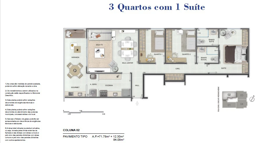 Apartamentos de 3 Quartos com 84m²;