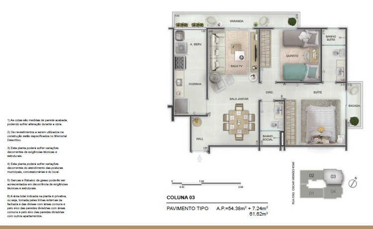 - Apartamentos de 2 quartos com com 61m²;
